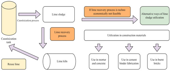 Lime sludge is a byproduct produced in various industrial processes, mainly in the paper industry and water treatment plants. In the pulp and paper industry, a significant source of lime sludge, approximately 100–200 kg of LS, can be generated per ton of pulp produced. Global pulp production is around 185 million tons annually, which could imply around 18.5 to 37 million tons of lime sludge per year from this sector alone [91]. Lime sludge can vary in composition depending on the specific industrial process and the impurities in the treated lime. However, it primarily contains calcium carbonate (CaCO3) [92]. LS can have beneficial applications as a waste material, as adopted and illustrated in Figure 1, particularly in soil stabilization and construction materials [93].