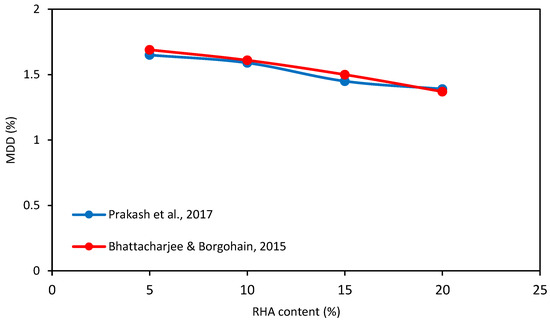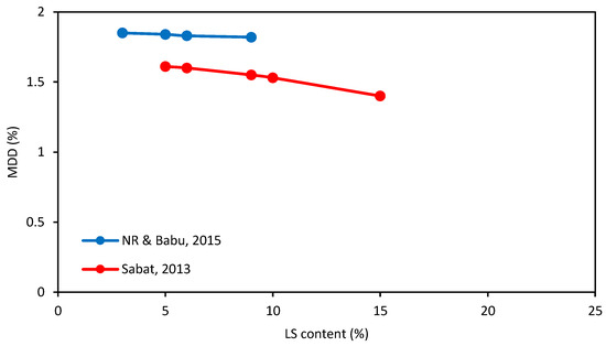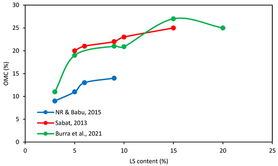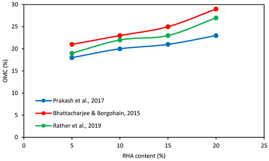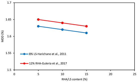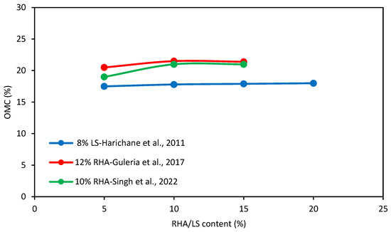 Assessing the compaction characteristics of soils for stabilization purposes is commonly used in geotechnical engineering. Different studies were reviewed to determine the Optimum Moisture Content (OMC) and Maximum Dry Density (MDD) of stabilized soil samples using the standard Proctor compaction test [98,105,106,107,108,109,110,111,112]. The results from the literature show that the OMC of soil samples increases and the MDD of soil samples decreases as the LS and RHA content increases in soil stabilization processes. During the pozzolanic reaction, the hydration of LS and RHA particles occurs, forming cementitious compounds such as CSH and CASH gels. This reaction consumes water, necessitating a higher water content to maintain an appropriate moisture level for the reaction to take place, leading to an increase in the OMC of the soil. Simultaneously, adding LS and RHA also influences the soil particle arrangement. The cementitious compounds formed help to fill void spaces and enhance the development of a more compacted soil structure, leading to an increase in the MDD of the soil. The analyzed results show that increasing the LS percentage in the soil sample from 5% to 10% resulted in a sudden decrease in the MDD value. Deploying RHA alone as an admixture in clay soil samples results in an increase in the OMC and a decrease in the MDD due to the lower density of rice husk ash compared to the expansive soil. Similarly, incorporating LS as a binding material with RHA and the soil sample also leads to an increase in the OMC and a decrease in the MDD value. In this context, the decrease in the MDD value can be attributed to the lower density of lime sludge compared to the expansive soil. To clarify the results obtained from the literature, the variation in OMC and MDD based on different admixtures is shown in Figure 2, Figure 3, Figure 4, Figure 5, Figure 6 and Figure 7. Methodological differences can impact the findings when comparing different results across different studies on clay soil stabilization using green alternative materials. These differences, such as clay mineralogy, soil gradation, soil preparation, curing duration, and environment, may influence the measured variations in results between studies. However, for the sake of simplicity, when comparing the results, methodological differences are not considered.