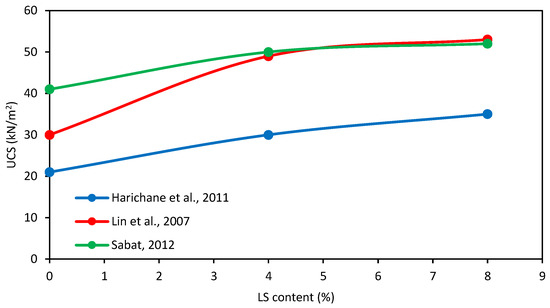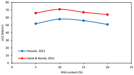The unconfined compressive strength test is a laboratory test to determine improved soil strength and load-bearing capacity. The UCS test is commonly performed on cylindrical soil specimens under axial compression without lateral confinement. Different references were reviewed to present the relationships between the UCS values of different mixtures and varying amounts of RHA and LS content added to the soil samples [111,114,115,116,117,118]. The review of the extracted results is shown in Figure 8, Figure 9 and Figure 10.