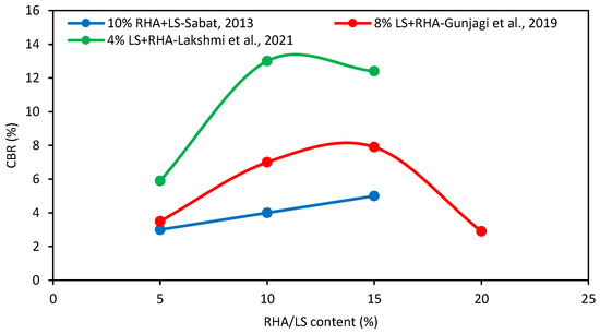 California Bearing Ratio is a laboratory test to evaluate the strength and load-bearing capacity of soils commonly used in geotechnical engineering, particularly in road construction. The compaction process uses a specific compaction effort to achieve the desired density and moisture content representative of the in-situ conditions. Proper compaction at the OMC ensures that the soil is compacted to its optimum condition for bearing capacity and strength, which is crucial for the design and construction of roads, embankments, and other civil engineering structures. The curing period, another significant governing parameter in the CBR test, directly impacts the CBR value obtained. CBR values increase with increasing curing periods, resulting in more accurate representations of the soil performance under the applied loads [119]. The CBR values, as shown in Figure 11, were determined by analyzing the results obtained from different references [109,120,121].