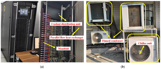 Data cabinet and cooling system photos: (a) the cabinet internal structure; (b) outdoor cooling unit.