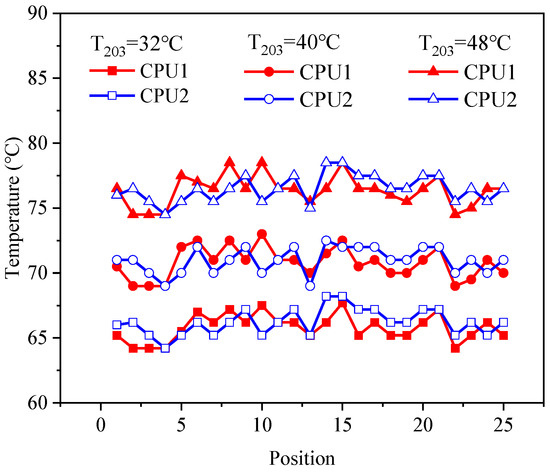 Figure 4 illustrates the temperature performance of server chips at different locations under varying, set control temperatures. During the testing, all servers were maintained at full-load operation. The cooling system ensured the stable operation of all servers, with no significant correlation between chip temperature and the server’s position height. Specifically, when the temperature of the reservoir T203 was set at 48 °C, the chip temperature remained stable at approximately 76 °C, with temperature fluctuations within all servers controlled within 2 °C. Additionally, for the two CPU chips within the same server, despite temperature differences, there was no consistent pattern of the first or second chip exhibiting persistently higher temperatures, demonstrating good temperature uniformity.