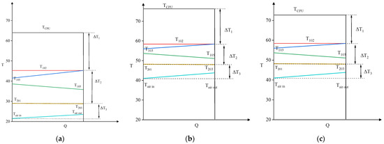 The T-Q diagrams of the chip cooling system: (a) regular cold plate, T203 = 28 °C; (b) regular cold plate, T203 = 48 °C; (c) microchannel cold plate, T203 = 48 °C.