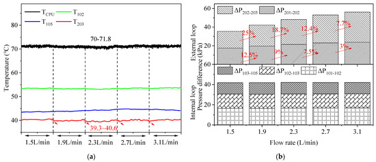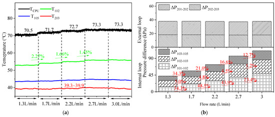 Maintain the temperature of the reservoir at 40 °C and gradually augment the flow rate within the internal loop for testing purposes. Figure 6 delineates the influence of the internal loop flow rate on system temperature and pressure drop. Throughout the experiment, the flow rate within the internal loop was incrementally raised from 1.3 L/min to 3.0 L/min. When the total flow rate reaches 1.3 L/min, providing an average of 1 g/s of working fluid to each layer of a server is sufficient to meet the normal operating requirements of its two internal CPU chips, demonstrating excellent heat dissipation and energy efficiency performance. With the augmentation in flow rate, T105, the temperature of the reservoir within the internal loop, exhibited a slight increase, whereas T102, the evaporation temperature, demonstrated a notable rise. The heat transfer temperature difference of the refrigerant within the internal loop also escalated. The elevation in flow rate augmented the pressure differentials, ΔP102–103 and ΔP103–105, spanning from the evaporator to the reservoir. The augmented resistance within the two-phase region was the principal factor contributing to the elevated evaporation temperature. Concurrently, TCPU, the core temperature of the chip, gradually ascended; however, the heat transfer temperature differential between TCPU and T102 remained relatively constant. This signifies that although increasing the flow rate does not markedly enhance heat exchange within the evaporator, it does amplify the system’s heat transfer temperature differential. Additionally, the augmentation in the internal loop flow rate substantially increased the pressure differential, ΔP101–102, from the liquid-phase manifold to the evaporator. Nonetheless, for the external loop, the pressure differentials across various segments remained virtually unchanged.