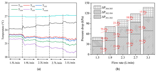 The temperature of the equipment room is maintained at 27 °C. The effect of flow on temperature and pressure drop is studied by adjusting the pump speed of PBTCS. As depicted in Figure 8, the experimental results indicate that an increase in flow rate leads to a steady rise in the pressure drop across the PFHE ΔP301–302, the vapor line pressure drop ΔP302–304, and the PHE condensation pressure drop ΔP304–305, although the rate of increase diminishes with higher flow rates. Each increment in flow rate results in a rapid increase in the saturation temperature at the PFHE inlet, followed by a gradual stabilization, while the temperature at the PFHE outlet decreases noticeably with each increase in flow rate due to the increased resistance in various parts of the system. In fact, the temperature difference caused by the resistance of the PFHE constitutes the majority, exceeding 50% of the total fluid temperature difference. Assuming no overheating within the PFHE, augmenting the flow rate elevates the evaporation temperature while lowering the condensation temperature. The peak temperature difference within the fluid loop, designated as ΔT301–305, rises from 2.3 °C at a flow rate of 1.5 L/min to 6.5 °C at 3.1 L/min. The pump, responsible for powering the entire loop, exerts a minimal impact on the convective heat transfer coefficient. As the system nears the “ideal cycle”, further increasing the flow rate may adversely affect the system [16].
