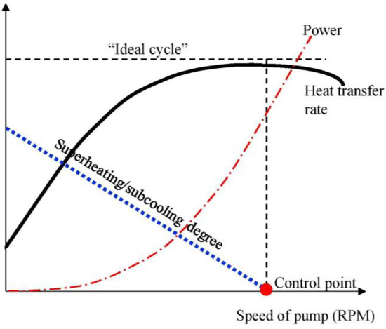 The “ideal cycle” typically assumes the absence of superheating, subcooling, or pressure drop [16]. However, in practical applications, these conditions are often unattainable. Experiments conducted in this study on various pump-driven loops reveal that compared to two-phase natural circulation, the primary function of the pump is not to enhance heat transfer but to provide mechanical power for flow distribution. As shown in Figure 9, the control strategy of the pump significantly impacts the performance of the cooling system. Before reaching the control point, insufficient evaporator flow leads to extensive superheating, with the heat transfer rate gradually increasing as the flow rate rises. Once the pump’s rotational speed reaches the control point depicted in the figure, further increases in speed result in excessive flow, thereby augmenting the pressure drop and heat transfer temperature difference, which in turn diminishes the system’s heat transfer rate. For chip cooling, influenced by chip power fluctuations and flow distribution, the pump’s rotational speed typically exceeds the control point to stabilize chip temperature. Provided that chip temperature remains unaffected, the cooling system’s performance can be enhanced by reducing the pump’s rotational speed. For backplane cooling, which targets air cooling, it is recommended to maximize the dryness at the backplane outlet, even permitting slight superheating at the exit, to bring the system closer to the ideal cycle.