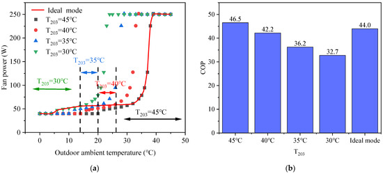 Figure 10 presents the energy consumption profile of a chip cooling system. Specifically, Figure 10a illustrates the power consumption of an outdoor condenser cooling fan under varying ambient temperatures. The reservoir temperature (T203) is set to one of four target values: 30 °C, 35 °C, 40 °C, or 45 °C. However, the fan’s overall operational trend remains consistent—low power at low ambient temperatures and increased power at higher ambient temperatures.