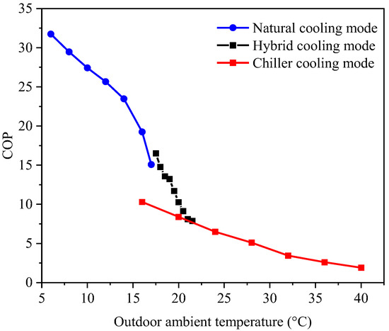 When the outdoor temperature exceeds 20 °C, due to the decreased temperature difference between the condenser and the outdoor environment, the cooling effect of continuing to operate the condenser becomes limited. Therefore, the system enters chiller cooling mode, where the condenser is bypassed by a three-way valve, and the cooling for the data center is solely provided by the chiller. In this mode, the COP of the cooling system gradually decreases as outdoor temperatures continue to rise.