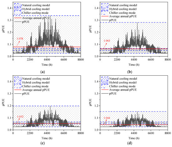 Influence of cabinet outlet air temperature on the cooling system pPUE: (a) cabinet outlet air temperature 24 °C; (b) cabinet outlet air temperature 27 °C; (c) cabinet outlet air temperature 30 °C; (d) cabinet outlet air temperature 33 °C.