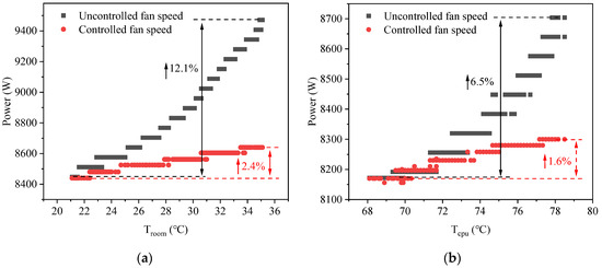 Figure 13 offers the impact of server room ambient temperature and CPU temperature on server power consumption. During the testing period, by effectively managing the core temperature of the chip, the DTCS ensured the continuous and stable operation of the server at a room temperature of up to 35 °C, with no instances of downtime. However, when the internal fan speed of the server was uncontrolled, the increase in both room and chip temperatures led to a significant rise in IT power consumption. Specifically, as the chip temperature rose, the leakage current within the semiconductor devices increased, resulting in an elevated overall power consumption of the chip [36,39]. Additionally, an increase in fan speed led to heightened fan noise, which further contributed to an increase in IT power consumption. The growth in power consumption exhibited a stepped nonlinear pattern, with higher temperatures leading to faster rates of increase. When fan speed control was applied, the increase in IT power consumption with rising room and chip temperatures became linear and significantly smaller. Specifically, as the room temperature increased from 21 °C to 35 °C, the growth rate of IT power consumption decreased from 21.1% to 2.4%. Likewise, as the chip temperature rose from 68 °C to 78 °C, the growth rate of IT power consumption dropped from 6.5% to 1.6%.