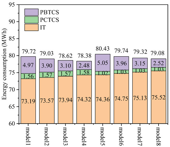 From the overall energy consumption trend shown in the figure, mode 4 (with the control temperature of the chip’s external loop reservoir set at 35 °C and the outlet air temperature of the backplane set at 33 °C) results in the lowest overall energy consumption of the data center. This is primarily attributed to the high performance of the chip cooling system, where even at a lower control target temperature, the energy consumption growth remains limited. In contrast, IT equipment has a higher power consumption, and even a slight increase in its energy consumption can lead to a significant power increase. Specifically, compared to model 4, the energy consumption of IT power in model 8 increases by 1.2 MWh, which is a relatively large increase.