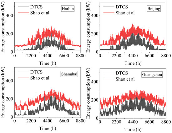 To better evaluate the energy-saving benefits of the DTCS, a comparison was conducted with the currently advanced integrated system utilizing liquid pump and maglev compressor, drawing upon data provided by Shao et al. [22]. Figure 15 illustrates the annual energy consumption distribution of cooling system in different cities. Notably, DTCS consumes significantly less energy than Shao’s integrated system in all four cities. This difference is especially pronounced at lower temperatures, as DTCS primarily operates in natural cooling mode, thereby enhancing energy savings. During higher temperatures, the energy consumption gap between the two systems narrows; however, integrated system energy usage consistently remains higher than that of DTCS. Harbin and Beijing, with their lower seasonal temperatures, exhibit minimal power fluctuations in winter, spring, and autumn. In contrast, Guangzhou, with its warmer climate, experiences high cooling energy consumption year round, resulting in greater power fluctuation and more frequent cooling system adjustments.
