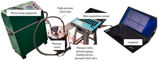 The specific parameters of the experimental equipment are as follows: pressurization equipment, the maximum output pressure of the pressurization equipment is 2.5 MPa, high-pressure flow is 108 L/H, with stable and reliable performance, safe and convenient to use, etc., which greatly improves the work efficiency. The water pressure output end is British 1/2 outer wire, good sealing, and stable output water pressure. Pressure vessel: the pressure vessel material selection of 45 # steel, the permissible stress of 200 MPa, for safety reasons, the maximum pressure inside the pressure vessel is estimated to be 3 MPa. of an international standard test core size of ϕ50 mm × 100 mm, the comprehensive consideration of the design of the pressure vessel internal dimensions of ϕ250 mm × 250 mm. then bring the above parameters into the Formula (1) to obtain the vessel wall thickness of 2.89 mm, indoor test for safety reasons, and the final design of the pressure vessel wall thickness of 2.89 mm. The wall thickness of the pressure vessel is set to 20 mm for the sake of safety in the indoor test, and the 3 mm buckle is set on the top cover of the pressure vessel for easy installation and waterproofing. Data acquisition system: DM-YB1820 dynamic and static strain gauge, this equipment has 20 strain data acquisition channels, each channel can independently collect test data. Strain data acquisition sensors can be collected at the same time. The schematic diagram of the device is shown in Figure 1 and Figure 2 below.