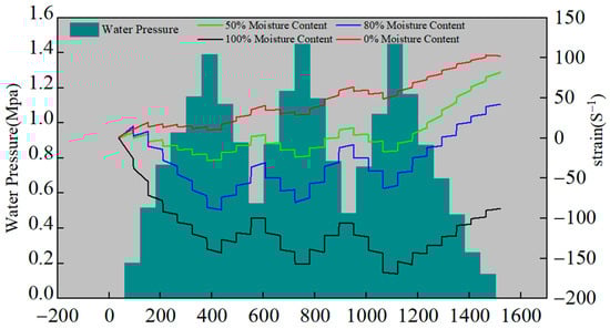 Figure 12 presents the complex relationship between the strain rate and moisture content of limestone cores in the water pressure test. Through the comparative analysis of the whole process, including pressurization and decompression states, it can be found that the strain rate change is closely related to the moisture content. Under the whole process and pressurization conditions, the strain rate gradually decreases with the increase in moisture content, and the two show a significant negative correlation linear relationship. The reason is that water fills the pores and micro-cracks of limestone, making the internal structure of the rock more compact. During the pressurization process, water exerts a lubricating effect and reduces the frictional resistance between particles, which makes the rock more prone to deformation when subjected to external pressure and finally leads to a decrease in strain rate. However, under decompression conditions, the strain rate gradually increases with the increase in moisture content, showing a positive correlation linear relationship. This is because during the decompression process, the water pressure in the pores is gradually released, and the supporting effect of water on rock particles is weakened. As the moisture content increases, the volume of water relatively increases. During decompression, it will cause a greater degree of pore pressure change, which makes rock particles more prone to relative displacement and rearrangement, thereby causing an increase in strain rate [].