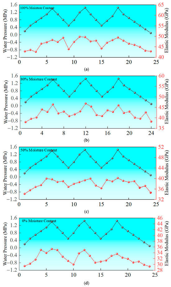Relationship between rocks with different moisture content and elastic modulus of specimens under different loading states. (a) Variation in elastic modulus of rocks with 100% moisture content under different loads. (b) Variation in elastic modulus of rocks with 80% moisture content under different loads. (c) Variation in elastic modulus of rocks with 50% moisture content under different loads. (d) Variation in elastic modulus of rocks with 0% moisture content under different loads.