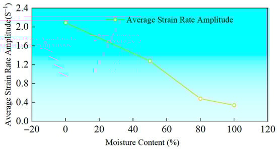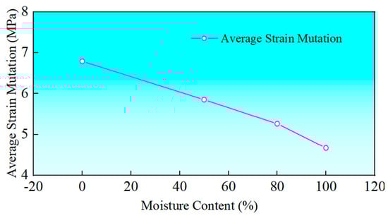 As can be seen from Figure 9, with the increase in moisture content, the average strain mutation value shows a decreasing trend. This is mainly attributed to the following two aspects. On the one hand, moisture will penetrate into rock pores and micro-cracks and play a lubricating role, thereby reducing the frictional force between rock particles and making the rock more prone to relative sliding and finally reducing the overall deformation. On the other hand, the increase in moisture will lead to an increase in pore water pressure and a decrease in effective stress, thereby weakening the ability of the rock to resist deformation and reducing the average strain mutation value under the same loading conditions. As can be seen from Figure 10, as the moisture content increases, the average strain rate amplitude decreases accordingly. The main reason is that the increase in moisture content makes the pore water pressure inside the rock rise and the effective stress decrease, which weakens the ability of the rock to resist deformation. Under the same loading conditions, the deformation ability of the rock is enhanced, resulting in a decrease in the average strain rate amplitude. Figure 11 shows that as the moisture content increases, the elastic modulus increases, and the two show a positive correlation. This is because as a porous medium, the internal water-bearing state of rock will change its mechanical properties. When the water pressure increases, the water pressure in the pores also rises correspondingly, which increases the effective stress between rock particles. The increase in effective stress means that the ability of rock to resist deformation is enhanced, thereby promoting an increase in elastic modulus.