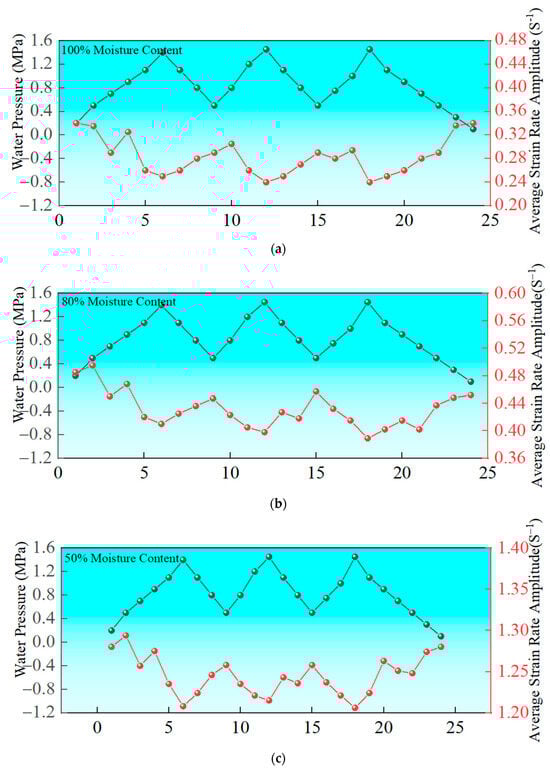 Figure 8 above shows in detail the evolution law of the elastic modulus of rock cores with different moisture contents under different loading states. The elastic modulus is a physical quantity that measures the stress–strain relationship of rock within the elastic range. It can directly reflect the ability of rock to resist deformation. That is, the higher the elastic modulus, the stronger the ability of rock to resist deformation []. It can be clearly observed from Figure 8 that with the change in water pressure load, the elastic modulus of rocks with different moisture contents shows a clear trend: when the water pressure gradually increases, the elastic modulus of the rock correspondingly increases; when the water pressure decreases, the elastic modulus also decreases. This change law reveals that there is a positive correlation between water pressure and rock elastic modulus. The main reason is that rock is a porous medium, and its internal water-bearing state will change its own mechanical properties. When the water pressure increases, the water pressure in the pores also increases, which makes the effective stress between rock particles increase. The increase in effective stress means that the ability of rock to resist deformation is enhanced, thereby promoting an increase in elastic modulus. In this case, the interaction between rock particles is closer and its structure is more stable. It is difficult to produce significant deformation when subjected to external forces. Conversely, when the water pressure decreases, the pore water pressure decreases, and the effective stress between particles also decreases accordingly. At this time, the stiffness of the rock becomes weaker, the ability to resist deformation decreases, and the elastic modulus also decreases. This change law clearly shows that there is a close positive correlation between water pressure and rock elastic modulus. In essence, the change in water pressure has a profound impact on the overall mechanical properties. In order to investigate the relationship between the specific average strain, modulus of elasticity, average strain rate amplitude, and water content in different water content states, this paper selected four water content conditions (100%, 80%, 50%, 0%) to carry out hydraulic loading experiments. In order to facilitate the analysis of the change rule, the average strain, elastic modulus, and the average strain rate amplitude of the four conditions of the relative average value of plotting, the specific images are shown in Figure 9, Figure 10 and Figure 11, and the specific parameters are shown in Table 1.