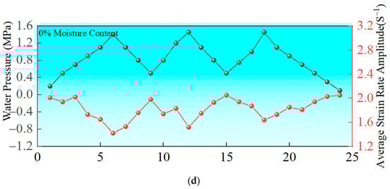 Relationship between different moisture content of specimens and average strain rate amplitude under different loading states. (a) Variation in average strain rate amplitude of rocks with 100% moisture content under different loads. (b) Variation in average strain rate amplitude of rocks with 80% moisture content under different loads (c) Variation in average strain rate amplitude of rocks with 50% moisture content under different loads. (d) Variation in average strain rate amplitude of rocks with 0% moisture content under different loads.