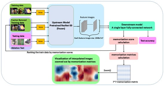 During the training phase, the original training data for the downstream task (as represented by the green box in the upper left corner of Figure 1) and the noisy training data will pass through the frozen upstream model to output feature images. Once the downstream model receives the input feature images, it will calculate the memorization score and memorization matrix corresponding to each image. The memorization matrix is a 7 × 7 matrix that represents the spatial memorization scores of the image. Using a nearest-neighbor-like interpolation zoom-out algorithm, the memorization matrix is projected onto the original image, resulting in a visualized explainability image. All of the memorization scores will then be provided for the final ablation test to exclude the top-k% high-score training data, as presented in the ablation test box on the left side of Figure 1. The training part of the ablation test involves excluding a certain fraction of high-importance training data and then training the downstream model using the same training process as aforementioned. For the testing part, the complete test dataset is passed through the upstream model to output feature images, which are then classified by the downstream model to measure accuracy.