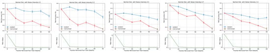 - An interesting phenomenon across all datasets is that, as the noise intensity increases, the red line tends to approach the blue line more closely when less than 10% of the training data is excluded. This trend is particularly noticeable when the noise intensity reaches 1.0. This occurs because data with exceptionally high memorization scores are mostly concentrated in the top 10% (as shown by the green lines). As the noise intensity increases, the top 10% of data with high memorization scores no longer entirely consist of the high memorization-score data from the original, noise-free dataset. Many of these data instances are likely originally low memorization-score data that, after being subjected to high-intensity noise, are misidentified by the model as high memorization-score data, thus being considered as good training data. Under such interference, the impact of the top 10% of important data on the model becomes less significant, resulting in performance that is nearly identical to randomly excluding 10% of the data.