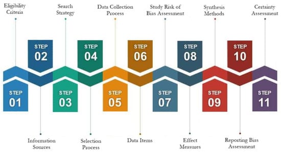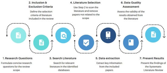 To effectively conduct this systematic literature review, a sequential procedure consisted of 7 key steps, as illustrated in Figure 2. In step 1, key and concise research questions related to the review scope are formulated. In steps 2 and 4, the literature selection inclusion and exclusion criteria were defined to determine the literature to be used in the study, and the qualifying studies were selected based on the inclusion criteria. In step 3, a thorough search of the relevant literature in various databases was conducted. Once the relevant literature was selected, key information to be used for the analysis of the systematic literature review was extracted in step 5. In step 6, a data quality assessment of the selected literature was conducted, and lastly, for step 7, the results of the conducted systematic literature review have been presented in Section 3.