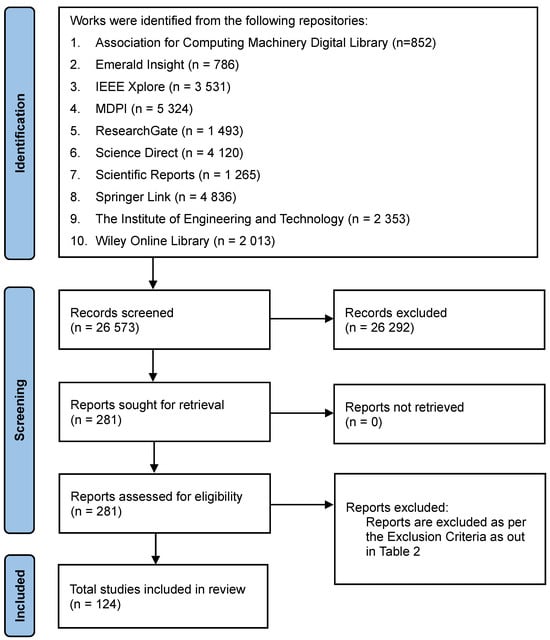 For this systematic literature review, the collected literature as per the inclusion and exclusion criteria was sourced from 10 high-quality, reputable repositories that facilitate peer reviews for all their published research, namely, the Association for Computing Machinery Digital Library, Emerald Insight, IEEE Xplore, MDPI, ResearchGate, Science Direct, Scientific Reports, Springer Link, The Institute of Engineering and Technology, and Wiley Online Library.