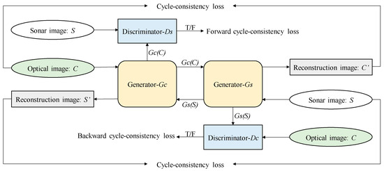 The model has two pairs of GANs that have a generator and discriminator. The generators are used for style transferring between optical images and sonar images. The optical image C is taken as input, and the generator Gc converts C into a pseudo-sonar image Gc(C). Then, the generator Gs converts Gc(C) into a pseudo-optical image C’. Symmetrically, the optical image S is taken as input, and the generator Gs converts S into a pseudo-optical image Gs(C). Then, the generator Gc converts Gs(C) into a pseudo-sonar image S’, while the discriminator is used to distinguish between real and generated pseudo images (Gc(C) and Gs(S)).