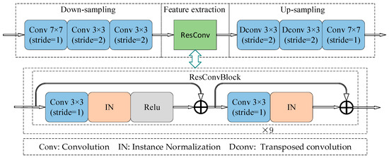 In the proposed CycleGAN model, each generator consists of three parts, namely, down-sampling, feature extraction, and up-sampling, as shown in Figure 3. Down-sampling consists of three convolutional layers, which can reduce the image size and enlarge the receptive field. Feature extraction consists of nine stacked residual convolution blocks. Each block plays a role in learning more complex features, which helps improve the quality of generated images. Up-sampling consists of three convolutional layers. Up-sampling restores the feature map to an image of the same size as the input.