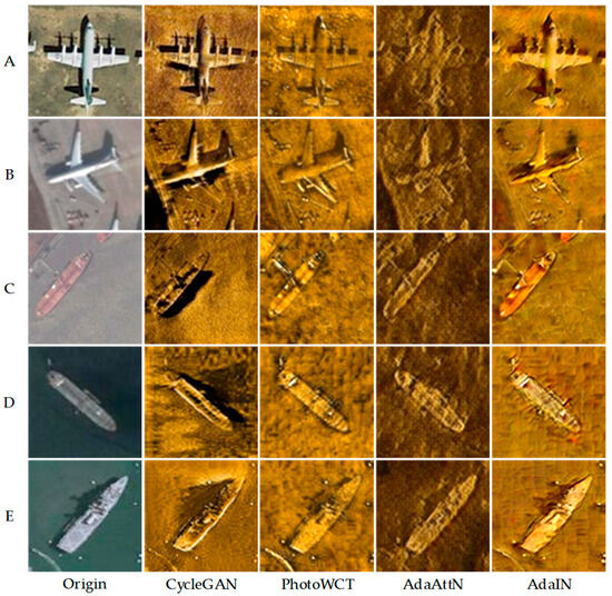To demonstrate the validity of CycleGAN, the generated images were compared with those of other style transfer models (PhotoWCT [29], AdaAttN [30], and AdaIN [31]) on the same dataset, as shown in Figure 8.