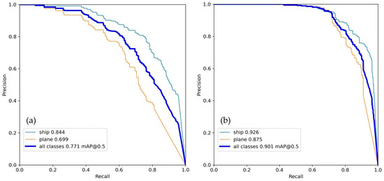 Comparison of precision–recall curves of detection accuracy on sonar dataset using the original YOLOv8 (a) and the improved YOLOv8 (b).