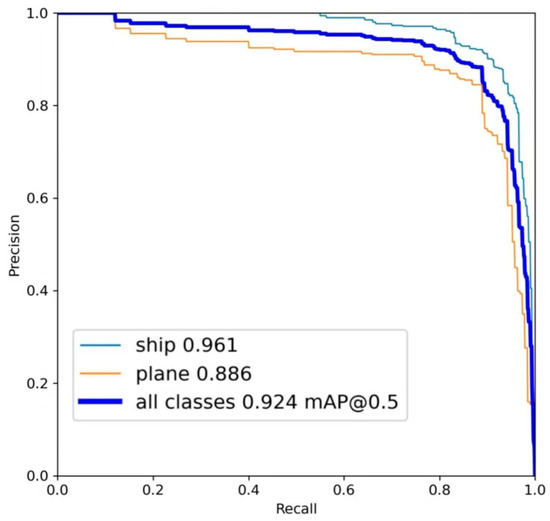 To demonstrate the advantage of combining the CycleGAN and the improved YOLOv8 models, a bottom detection experiment using our model on Dataset E was conducted, and the result is shown in Figure 10. The overall detection accuracy mAP@0.5 was 0.924, which was 2.3% higher than the result (Figure 9) on the initial dataset (Table 1). Moreover, the detection accuracy mAP@0.5 of the ship and plane targets were 0.961 and 0.886, which were 3.5% and 1.1% higher than the results, respectively (Figure 9).