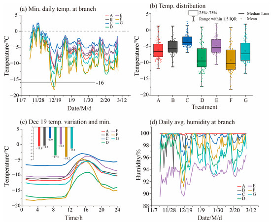 3.1. Changes in Temperature and Humidity at the Grapevine Branches During the Overwintering Process of Different Treatments