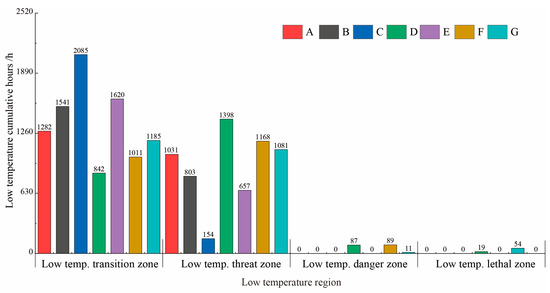 - Cumulative duration in low-temperature threat zone (−13 °C ≤ T < −5 °C)