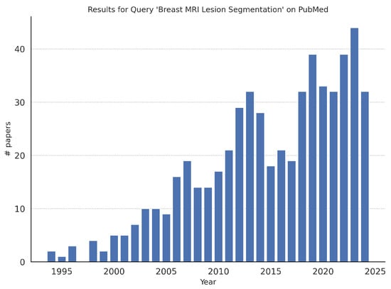 Trend in the number of indexed studies on PubMed related to “breast MRI lesion segmentation” over the years. The graph illustrates the growing interest and research activity in this field.