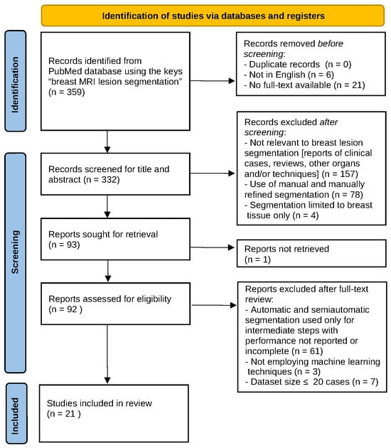 Studies published between January 2013 and July 2024 were searched in the PubMed database (US National Library of Medicine, http://ncbi.nlm.nih.gov/pubmed, accessed on 31 July 2024). The research query included the terms “breast MRI lesion segmentation” to identify studies involving any type of breast lesion, benign or malignant, detectable by any MR imaging modality. Each record (title and abstract) retrieved was manually screened by a reviewer, and ineligible records were removed. The selection procedure is illustrated in the flowchart in Figure 2, following the PRISMA 2020 guidelines []. The initial search yielded 359 records for the specified keywords and time interval. Before screening, records were checked for duplicates (0 cases). Papers not in English were removed to avoid language barriers and potential misunderstandings from poor translation (6 cases), and papers without accessible full texts were also excluded (21 cases). This left 332 records to be screened based on titles and abstracts. Records deemed off-topic, such as those involving clinical trials, case reports, general reviews, or studies related to different organs and imaging modalities, were discarded (157 cases). Additionally, articles that only included manual segmentation were excluded (78 cases), as well as studies focused on segmenting the whole breast tissue rather than the lesion itself (4 cases). This process resulted in 93 papers assessed for eligibility. After a full-text review, records that lacked specificity regarding segmentation, either using it only as an intermediate step without reporting segmentation performance or failing to provide proper validation, were excluded (61 cases). Moreover studies that did not use any machine learning techniques were excluded (3 cases). Studies employing automatic segmentation techniques with very small datasets (≤20 patients) were also removed, as small sample sizes can lead to unreliable and non-generalizable results (7 cases). Ultimately, 21 articles were included in the review. All the included studies were approved by the respective local institutional review boards. Written informed consent was obtained for most cases, ensuring that no personal information could be identified. In other cases, informed consent was not required as the data were either fully anonymised or publicly available. The articles were analysed by examining the aim of the segmentation task, the type of model used, the MRI sequences employed with consideration for multiparametric models, and the sample size and data quality, with attention to the generalizability and flexibility of the proposed pipelines. The results and discussion are presented in the subsequent sections.