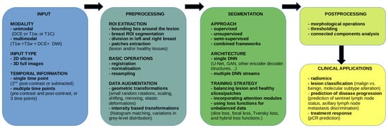 Despite the remarked differences, general agreement in terms of preprocessing steps was found in most of the studies. Instead of manually selecting a bounding box around the lesion, to achieve a fully automatic procedure, it is useful to first perform breast segmentation and then perform lesion segmentation only within the breast ROI. This step is essential to prevent false positives due to enhancement in the heart region and other possible confounding organs with similar enhancement. Moreover, this step also serves to reduce the computational burden of considering the whole image. For this purpose, some studies also employed division into left and right breasts to double the training sample size in a natural manner or the use of even smaller boxes. However, this approach, while benefiting from one side, removes the possibility to use bilateral breast symmetry to evaluate possible false positives due to intrinsic parenchymal enhancement, as mentioned by Min [] and Zhang []. A good compromise might be represented by more complex models involving multiple streams for lesion detection, boundary characterisation, and segmentation, as for instance the one proposed by Sun et al. []. Moreover, when using multiple images, registration, normalisation, and resampling are often necessary. For deep learning approaches, data augmentation also represents a key step to train the model with its full potential and to improve its generalisation capabilities. Data augmentation usually involves small random rotations, scaling, shifting, mirroring, elastic deformations, and variations in grey-level distribution. In terms of postprocessing, in some cases, small components were ignored by posing a threshold on lesion size or keeping only the larger fragments. However, traditional ML approaches to classify the proposed lesions as normal or suspicious could be used, as for instance made by Min et al. []. For DL approaches, the tuning of the binarisation threshold is also essential to correctly balance false positives and undetected lesions.