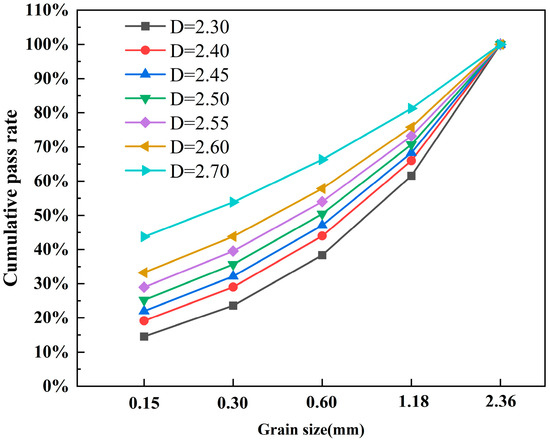 The fractal dimension D is utilized to quantify the irregularity of complex shapes, indicating the extent of their effective occupation within a given space. Through the fractal formula of grading gangue particle size, given different fractal dimensions (D), different grading curves can be obtained. Then, the passing percentage of each particle size of the aggregate can be calculated. The authors of reference [36] deduced the aggregate particle size distribution equation based on fractal theory: