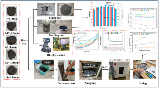 To explore the impact of the fractal dimension on the rheological properties and sedimentation performance of CSFMs, and to establish an evaluation method for the fluidity and sedimentation performance of coal gangue filling slurry based on fractal theory, experiments were conducted on the slump, expansion, bleeding rate, rheology, and sedimentation of CSFMs with different fractal dimensions. In the rheological test, slump test, and bleeding rate test, three independent samples were prepared for each experimental series, and three repeated tests were performed on each sample to reduce errors and improve the reliability of the results. In the settlement experiment, because the research focus is on the settlement behavior of the slurry, the experiment was only measured once, but the samples were taken at multiple time nodes and different height regions to ensure the representativeness of the data. The experimental process is illustrated in Figure 3.