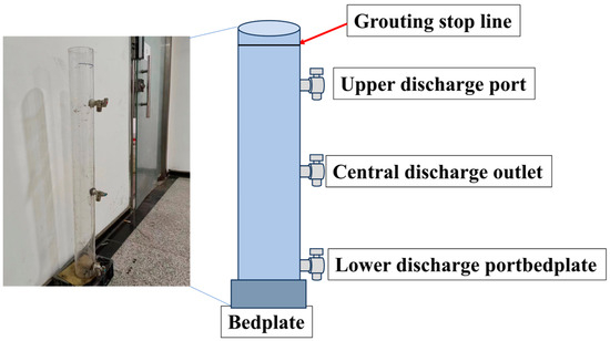 As shown in Figure 4, a settlement system with a diameter of 0.1 m and a height of 1 m was designed. The recovery port is set at 10 cm, 45 cm, and 80 cm from the bottom of the transparent tube, and the settlement of gangue with different particle sizes in the gangue slurry at different times is analyzed. The fully mixed gangue slurry is poured into the instrument to measure the settlement. After the experiment began, samples were taken at 5 min, 10 min, 15 min, 30 min, and 60 min on the upper, middle, and lower parts of the settlement instrument. Then, the drying oven temperature was set to 50 °C, and the sample was placed in a drying oven and dried for 48 h. After the dried samples were removed and crushed, they were sieved, and the mass of each particle size fraction obtained after screening was recorded.