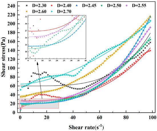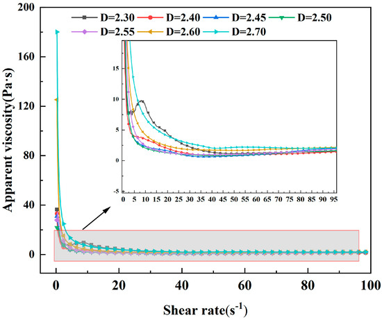 Figure 7 shows the change in the apparent viscosity with shear rate. The results demonstrate that the plastic viscosity of CSFMs initially decreases and then increases as the shear rate increases, showing the shear thickening phenomenon. When the apparent viscosity of the slurry decreases in the early stages, it may be because the shear action destroys the original network structure, resulting in a significant change in the arrangement direction of the solid particles and reducing its apparent viscosity. As the shear rate continues to increase, the apparent viscosity of CSFMs begins to increase, and the shear thickening is caused by the agglomeration of particle clusters [49]. CSFMs with D = 2.3 to D = 2.7 exhibit distinct critical shear rate points, where shear thickening occurs. This is consistent with the expected rheological index. According to the order–disorder transition theory, the shear thinning or shear thickening behavior of the slurry is governed by the interparticle forces and the degree of particle dispersion [54].