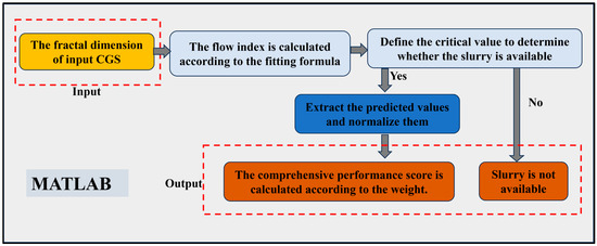 3. As shown in Figure 8, based on the different fractal dimensions and the corresponding flow performance index data collected by the experiment, the input and output relationship of the model is constructed using MATLAB (version 2021a) code. If the output slurry is not available, the fractal dimension can be adjusted by changing the particle distribution, and the comprehensive score FS of the flow characteristics can be brought in and calculated again. The score serves as an indicator of the slurry’s flow characteristics, with higher scores representing better performance. At the same time, when the comprehensive score FS of the flow characteristics of the slurry is more significant than 0.80, the flow performance of the slurry can be evaluated as excellent.