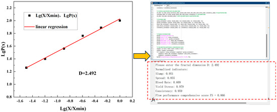 To verify the reliability of the model, the broken gangue is sieved, the logarithms of both ends of Equation (2) are taken, and the fractal dimension is calculated to be 2.492. The fractal dimension is substituted into the flow characteristics evaluation model for calculation. The calculation process is shown in Figure 9, and the comprehensive score is 0.8548, indicating that the flow characteristics are excellent. At the same time, the flow characteristics of the original graded gangue are verified by traditional experiments. The experimental results show that the mini-slump is 143 mm, the expansion is 316 mm, the bleeding rate is 4.31%, the yield stress is 20.41 Pa, and the consistency coefficient is 0.00088. Combined with the practice of slurry filling, the slurry has excellent fluidity, which proves the reliability of the model evaluation results. At the same time, the model is simple to calculate and has high practical value.