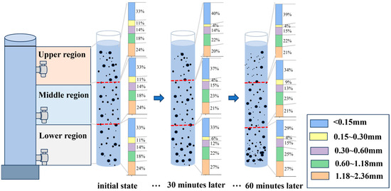 Figure 11 is a schematic diagram of particle distribution during gangue settlement. In order to facilitate the analysis, we divided the settlement instrument into three regions: upper, middle, and lower, and analyzed the solid mass fraction W and the fractal dimension DS of the particle size distribution in each region in different time periods. The pair (2) can be obtained by taking logarithms on both sides: