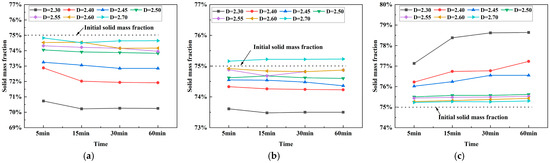 The change in the slurry solid mass fraction in the process of sedimentation. (a) The upper part of the settlement instrument; (b) The middle of the settlement instrument; (c) the Lower part of the settlement instrument.