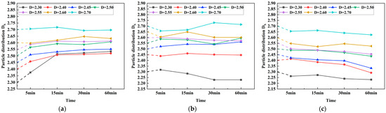 Figure 13 shows the dynamic fractal distribution DS of particles in different regions of the slurry with different fractal dimensions during the settlement process. The analysis shows that the smaller the fractal dimension of the original slurry, the more significant the particle size distribution changes. In the upper area of the sedimentometer, for the slurry with D = 2.3–2.7, the DS shows an upward trend with the settlement process, and with the increase in the original fractal dimension, the change range of the fractal distribution gradually decreases. This is because the gangue with a large particle size settles fastest in the process of slurry settlement, resulting in a rapid decrease in the content of large particles in the upper region [60]. In the middle area of the sedimentation instrument, the particle distribution Ds of the slurry with a fractal dimension of 2.3 showed a significant downward trend with the sedimentation time. Still, the decline was gentler than in the upper area. At the same time, the variation of the fractal distribution DS of the slurry particles with the fractal dimension D of (2.5–2.7) is relatively stable. In the lower area of the sedimentation instrument, the fractal distribution coefficient DS of the particles shows a significant downward trend with the sedimentation time. With the increase in the original fractal dimension, the change in the fractal distribution is further slowed. This is because the particles are gradually settled to the lower part of the settlement instrument under the influence of gravity. The settlement speed of large particles is fast and a stable sedimentary layer is formed.