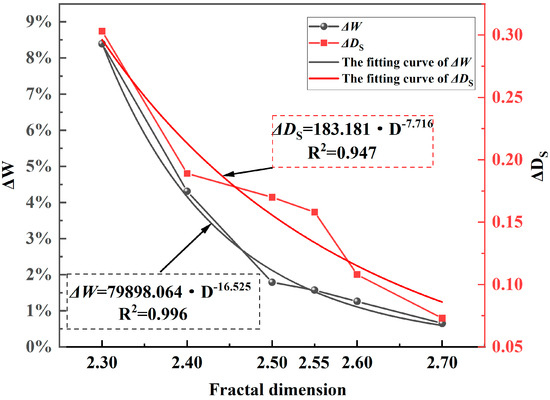 ΔW is used to represent the solid mass fraction difference between the upper and lower regions when the slurry settles for 60 min, which can characterize the separation effect of the slurry settlement. ΔDS is used to represent the difference between the fractal distribution DS of the upper and lower regions of the settler when the slurry settles for 60 min. It represents the difference in the distribution of particles during the settlement process. The ΔW and ΔDS of CSFMs with fractal dimensions of 2.30, 2.40, 2.50, 2.55, 2.60, and 2.70 were analyzed (a CSFM with D = 2.45 was used as verification). Figure 14 shows the influence of the particle size distribution of different gangue aggregates on the ΔW and ΔDS of slurry. The analysis shows that an increase in the fractal dimension will reduce the difference in the particle distribution and solid mass fraction in the process of slurry settlement, which further reflects that the settlement process of high-fractal-dimension slurry is more uniform. With the increase in fractal dimension D, both ΔW and ΔDS show a downward trend. When the fractal dimension D is (2.3–2.4), ΔW and ΔDS decrease the most. It shows that the stability of the slurry in this interval is poor.
