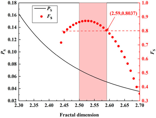 The pure gangue slurry (CSFM) prepared by the conventional crushing of gangue usually has problems such as poor fluidity and easy particle sedimentation stratification, which makes it difficult to meet the requirements of long-distance advection transportation. In order to solve the above problems, the analysis of the evaluation model of CSFM flow performance and sedimentation performance based on fractal dimensions is shown in Figure 16. In the range of (2.3–2.7), an average of 40 points are taken to analyze the influence of the fractal dimension on CSFM flow performance. The results show that when the fractal dimension of the CSFM is between 2.3 and 2.43, the flow performance evaluation model shows that the slurry is not available. The fractal gradation of particles can be optimized by increasing the content of fine particles. When the fractal dimension of CSFMs is between 2.45 and 2.59 (FS > 0.8), the CSFM shows better flow performance. Combined with the fractal dimension analysis of the slurry sedimentation performance, it was found that when D exceeded 2.50 (PS < 0.0707), the slurry showed good stability. Based on the evaluation of flow performance and settlement performance, it is recommended to select CSFMs with fractal dimensions between 2.50 and 2.59 to achieve the best balance between flow performance and settlement performance and ensure the reliability of long-distance transportation and construction quality. Although the model based on fractal dimensions performs well on coal gangue slurry, it should be pointed out that the application of the model still has limitations. The material composition of the coal gangue slurry discussed in this paper is only coal gangue and water and does not contain cementitious materials. However, for other types of slurry or filling materials, it still needs to be verified by further experimental research.