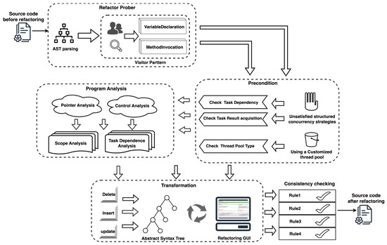 To address these issues, this paper proposes an automated refactoring method. This method first uses visitor pattern analysis to locate the unstructured code for refactoring. Then, it performs a precondition to filter the unstructured code and conducts a scope analysis. Scope analysis ensures that the variable scope remains unchanged after refactoring. Finally, the refactoring is completed in the AST (abstract syntax tree) based on the results obtained. Using this method, we implemented the automated refactoring tool ReStruct as a plugin within the Eclipse JDT [9] framework. This tool was used to conduct experiments on seven real-world projects, including SystemML [10] and Light-4j [11]. The experimental results evaluated ReStruct in terms of the number of refactorings, the changed LOCs, the refactoring time, and the performances of the refactored programs. A total of 82 refactorings were refactored by ReStruct, with an average time of 27.3 s for each project. These results demonstrate that ReStruct can effectively refactor unstructured concurrency to structured concurrency in Java.