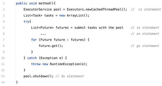 To better describe the refactoring method, we make the following definitions, as shown in Figure 3. Here, cs represents the statement that creates a thread pool, ss represents the statement that submits tasks with the thread pool, gs represents the statement that obtains the result of the execution of the task, ds represents the statement that destroys the thread pool, and os represents the statements located between ss and gs. Among them, the scope of the variables defined in os may change after refactoring.