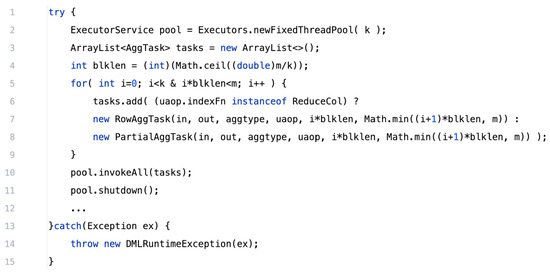 Check task result acquisition. In Java’s multithreaded task return mechanism, when a task is submitted, a Future object can be used to represent the returned result of the task. Using the method Future.get, we can obtain the result of the execution of the corresponding subtask or track the exception information from the subtask. If the method Future.get is not called in the main thread, even if an exception occurs in the subtask, it cannot be captured, as shown in Figure 5. The code snippet comes from the method aggregateUnaryMatrix of the class LibMatrixAgg in the project SystemML. In this code snippet, a fixed-sized thread pool is created, and a group of tasks is added to the task set (lines 2–10) first. Then, this group of tasks is submitted through the method invokeAll. Finally, the thread pool is closed (lines 11–12). However, this method does not obtain the returned result of invokeAll, so the main thread cannot use future.get to obtain the exceptions or the results of the subtasks. Therefore, regardless of whether the subtasks are executed successfully, the main thread will continue to execute. This clearly violates the strategy shutdownOnFailure in structured concurrency. Therefore, we need to determine whether a Future object has been returned after all the subtasks are submitted. Then, we need to judge whether the results of the task have been obtained through Future.get in the main thread. In this way, the main thread can capture exceptions in subtasks in a timely manner and terminate.